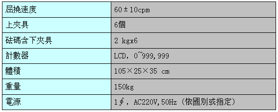 本機適用於測試皮鞋及旅遊鞋內底纖維板的耐曲折品質。在一定條件下反復曲撓試件直至其斷裂,根據曲撓次數計算出曲撓指數。可同時分別測試6組試件及分別顯示測試結果,均互不影響。
